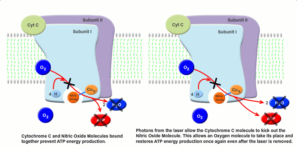 However, if Cyt C gets clogged up with a Nitric Oxide molecule, it can’t convert energy anymore. It’s not that it’s damaged at all, it’s just clogged up. Photons from the Low Level Laser(s) give the Cyt C the energy it needs to kick out the clogging Nitric Oxide molecule. The light isn’t needed for that molecule afterwards either so energy production continues even after the laser light is removed. The image above only shows one Cyt C molecule, but in a single mitochondria there are millions to billions of these Cyt C molecule. Say half are clogged up. How do you think you’re going to feel?